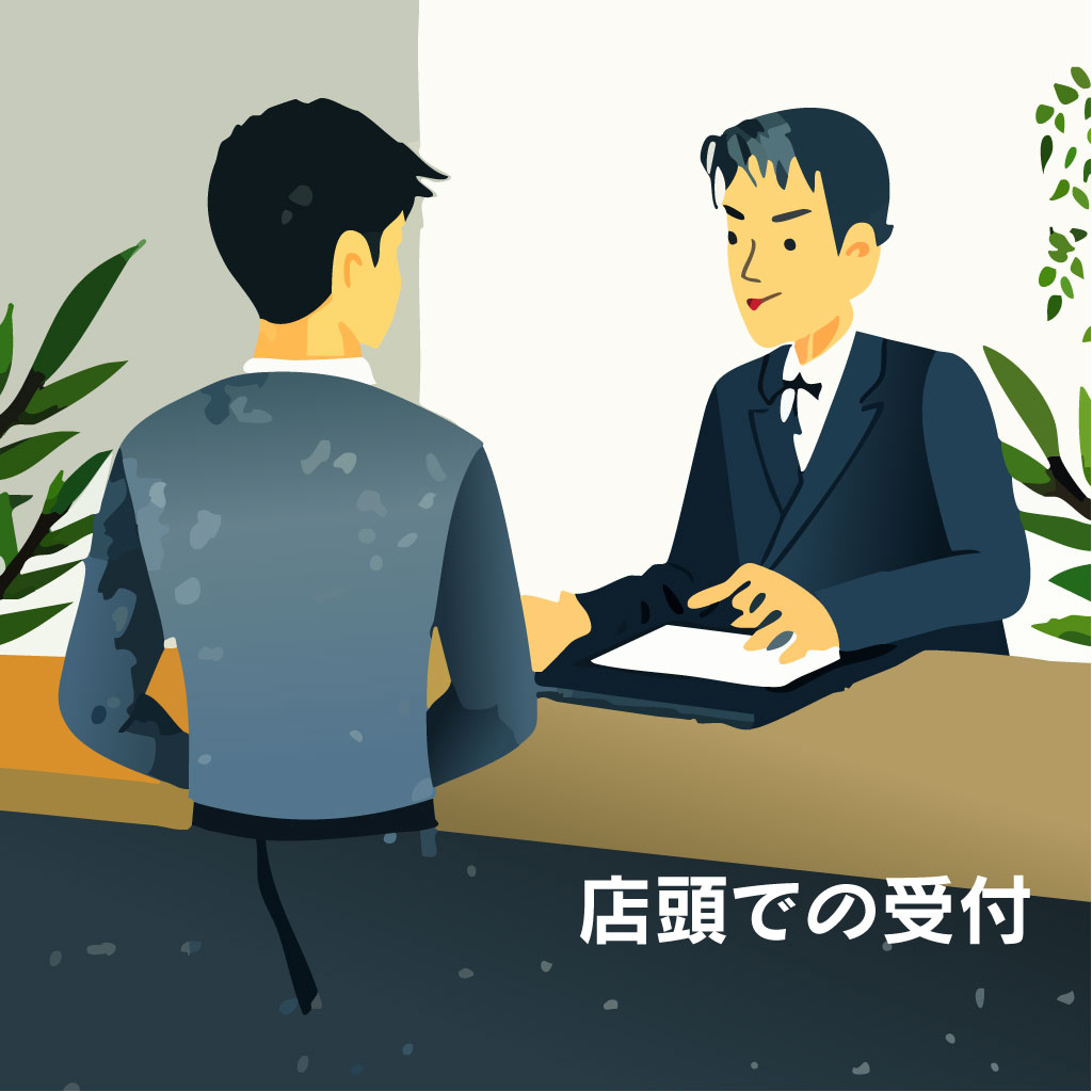 店内カウンターで向かい合って座る営業とお客さん。